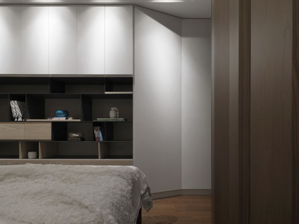 電視牆由工程石製成,延伸了入口處的牆壁設計,巧妙地起到了儲物櫃的作用。