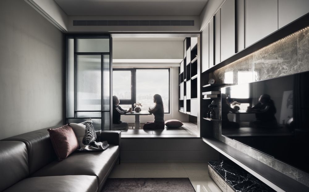 針對屋主想要的和式,營造出平穩放鬆的空間,平時想辦工時,把升降的書桌升起,即可開啟工作模式,做為書房使用,想休息時,從10樓遠眺出去窗外景色,別有一番寧靜的風味,若朋友來訪也可當作客房運用。