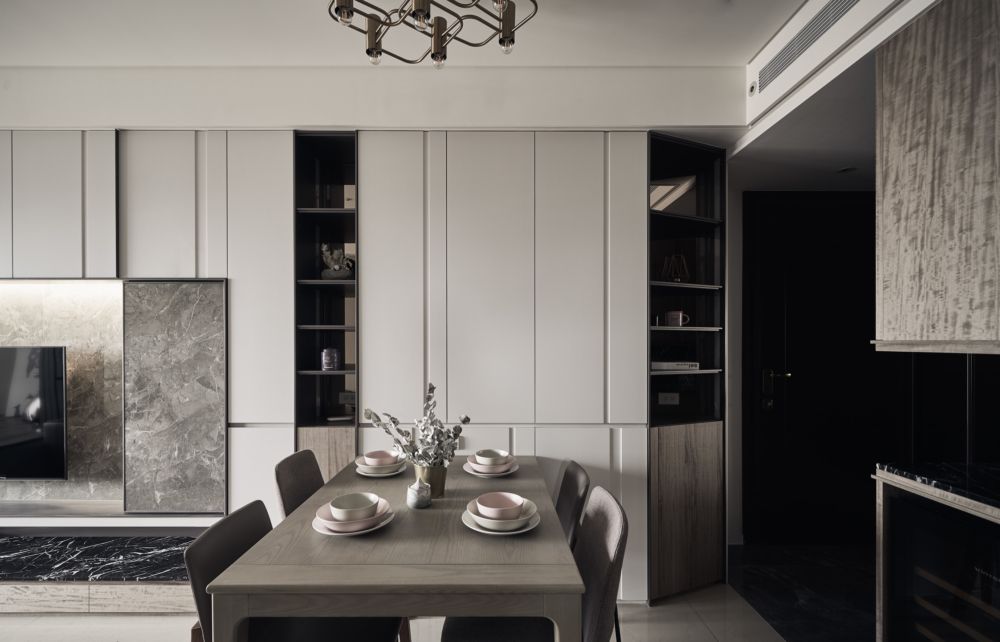 屋主是個精明幹練的單身女生的業務主管,坪數近20坪,兩房一廳一衛的格局,在設計上,仍想讓屋內保有女性柔和的感覺,屋內的色系採用低彩度,用線條、大理石石材、玻璃、鐵件去營造出簡約、現代的風格。
