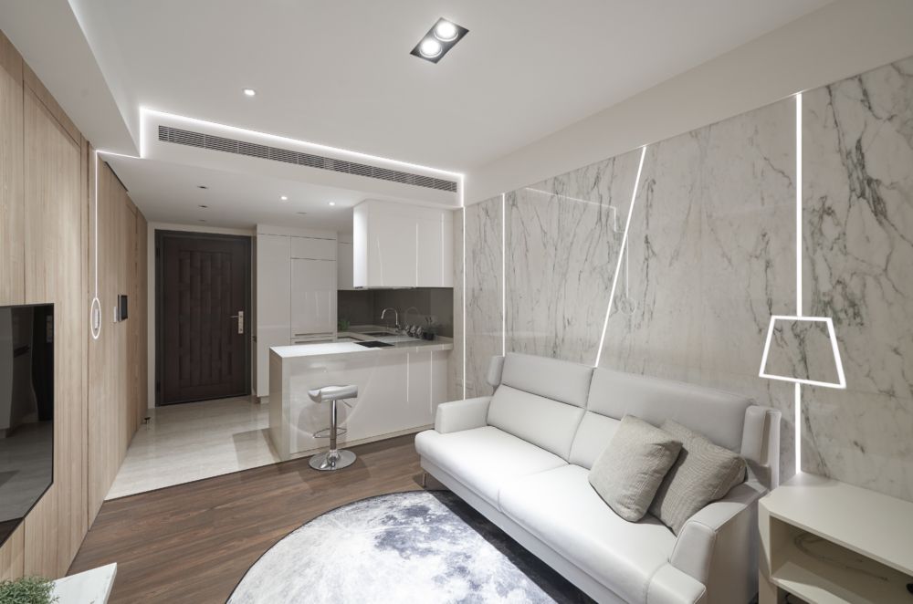 以深色木皮地版創造兩室分野,簡單的沙發座後以整面大理石譜寫基調,讓光從電視牆面延伸至大理石牆間,鑲嵌進石牆內的線性光束,開啟了空間的光亮,光讓冷調的大理石產生溫度,猶如石隙透出的光芒,充滿生機。門口延伸至主臥、客臥、書房、浴室的牆面及門片,採以相同色澤的木質面再以線性切割裝飾,達成整體立面的一貫性。